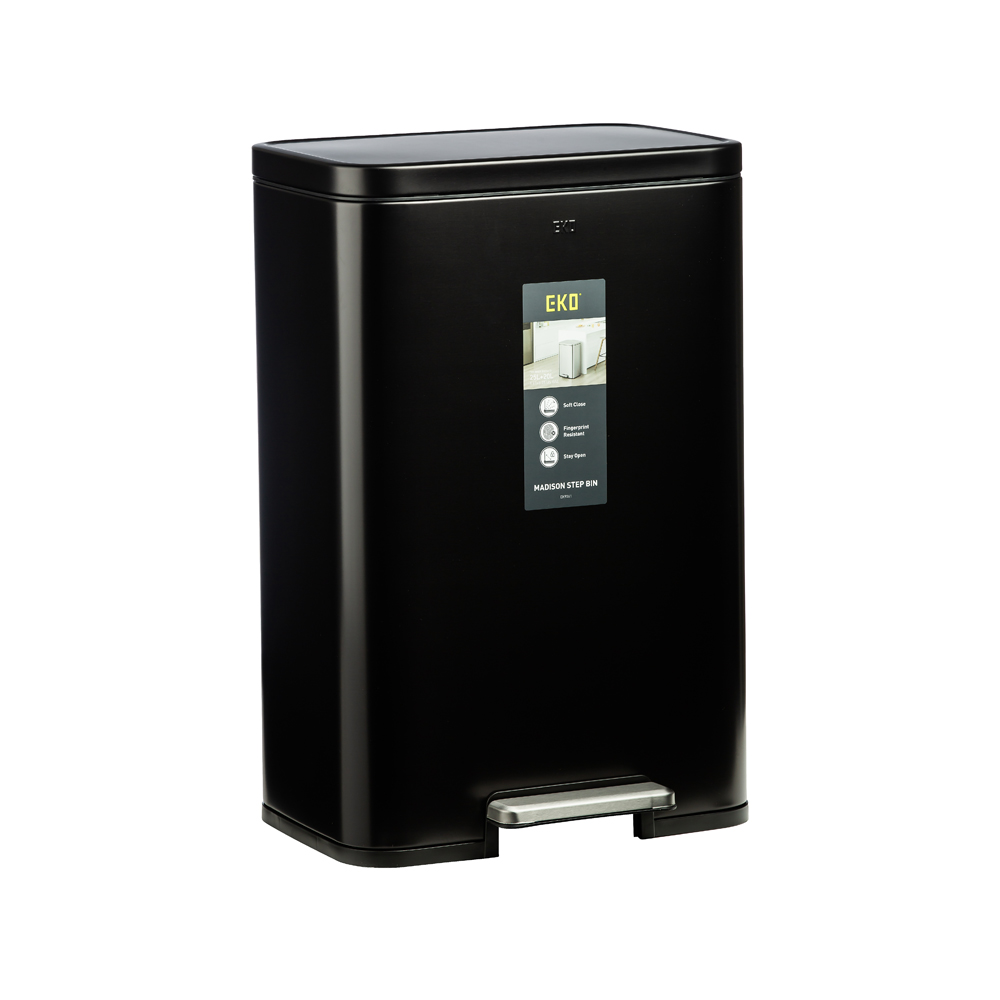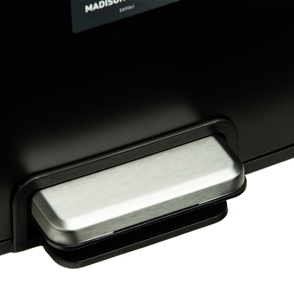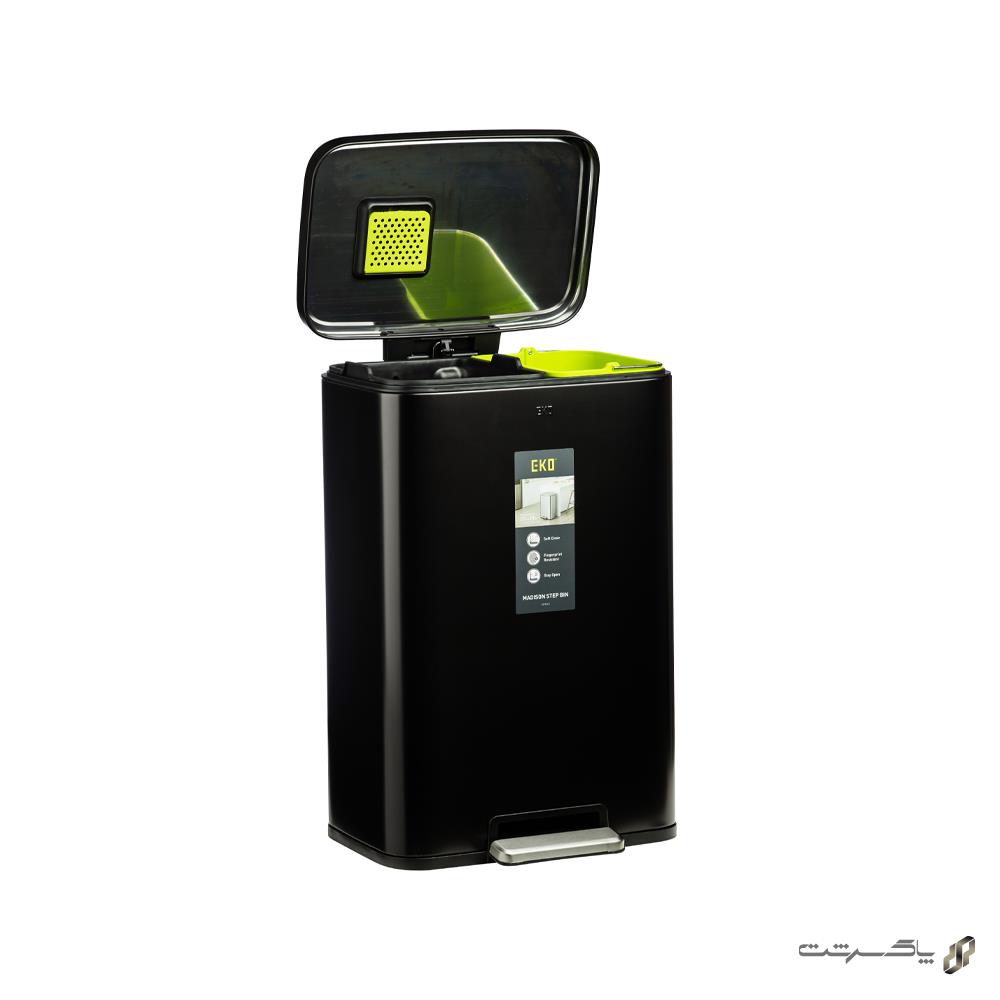 سطل زباله دو مخزنه ۴۵ لیتر (۲۵L+۲۰L) مدل 9361P-BL سری MADISON برند اکو، ساختهشده از متریال استنلس استیل ضدزنگ با رنگ مشکی بسیار شیک و عمیق، ظاهری مدرن، جسور و فوقالعاده لوکس به آشپزخانه، سرویس بهداشتی یا فضاهای متوسط شما میبخشد. این مشکی خیرهکننده و جذاب، فضا را حرفهای، مرتب و همیشه امروزی نشان میدهد و بهترین انتخاب برای دکوراسیونهای مدرن و صنعتی است.