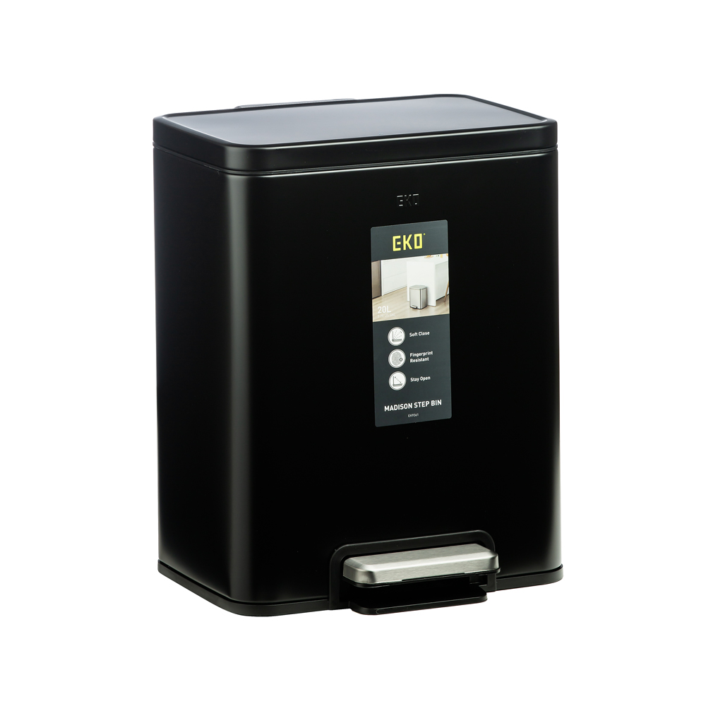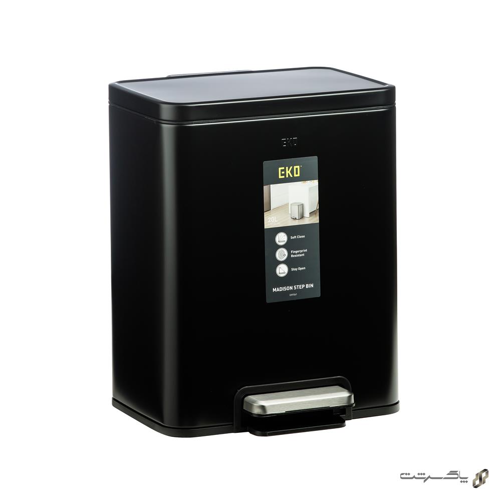 سطل زباله ۲۰ لیتری مدل 9361P-BL-20L سری MADISON برند اکو، ساختهشده از متریال استنلس استیل ضدزنگ با رنگ مشکی بسیار شیک و عمیق، ظاهری مدرن، جسور و فوقالعاده لوکس به آشپزخانه، سرویس بهداشتی یا فضاهای کوچک شما میبخشد. این مشکی خیرهکننده و جذاب، فضا را حرفهای، مرتب و همیشه امروزی نشان میدهد و بهترین انتخاب برای دکوراسیونهای مدرن و صنعتی است.