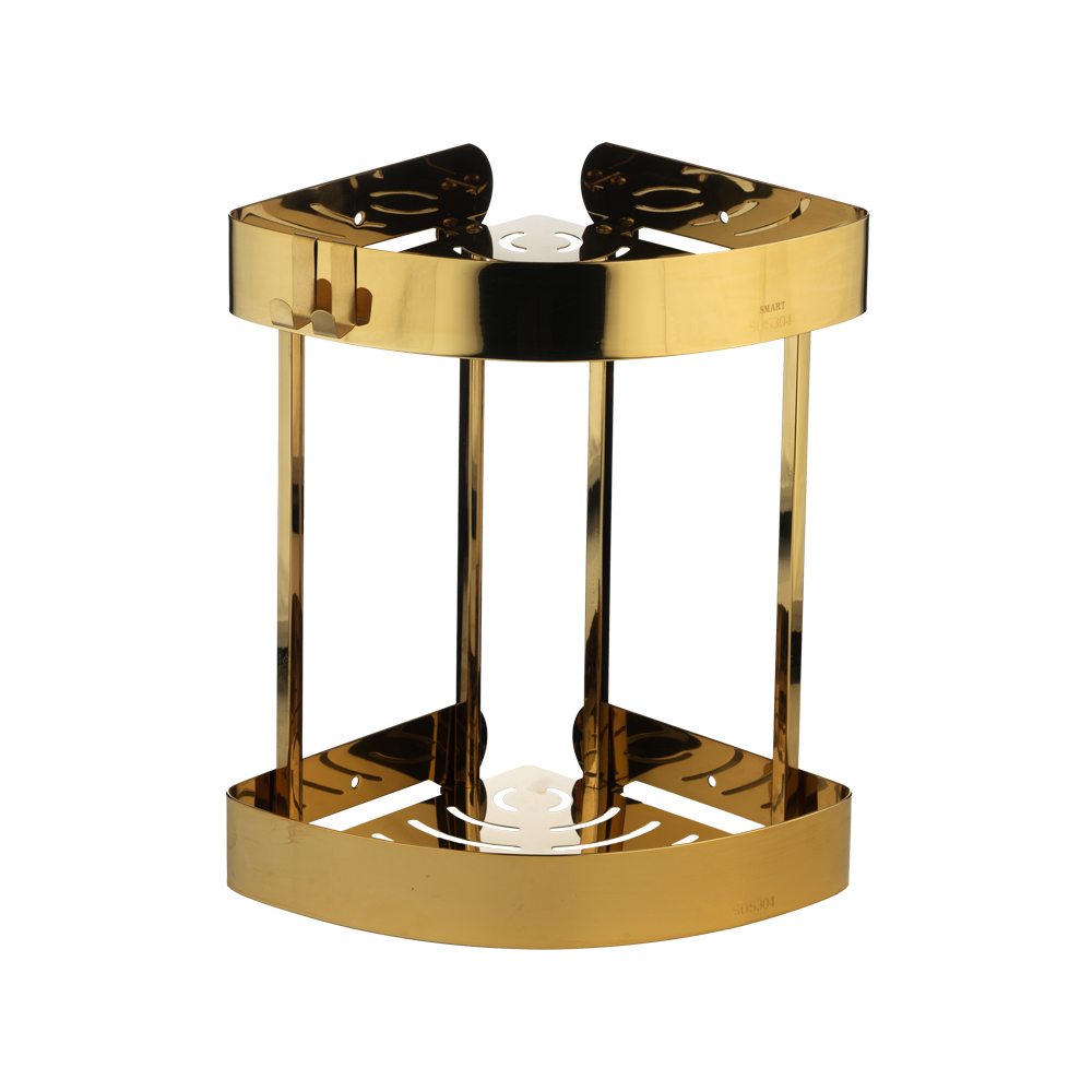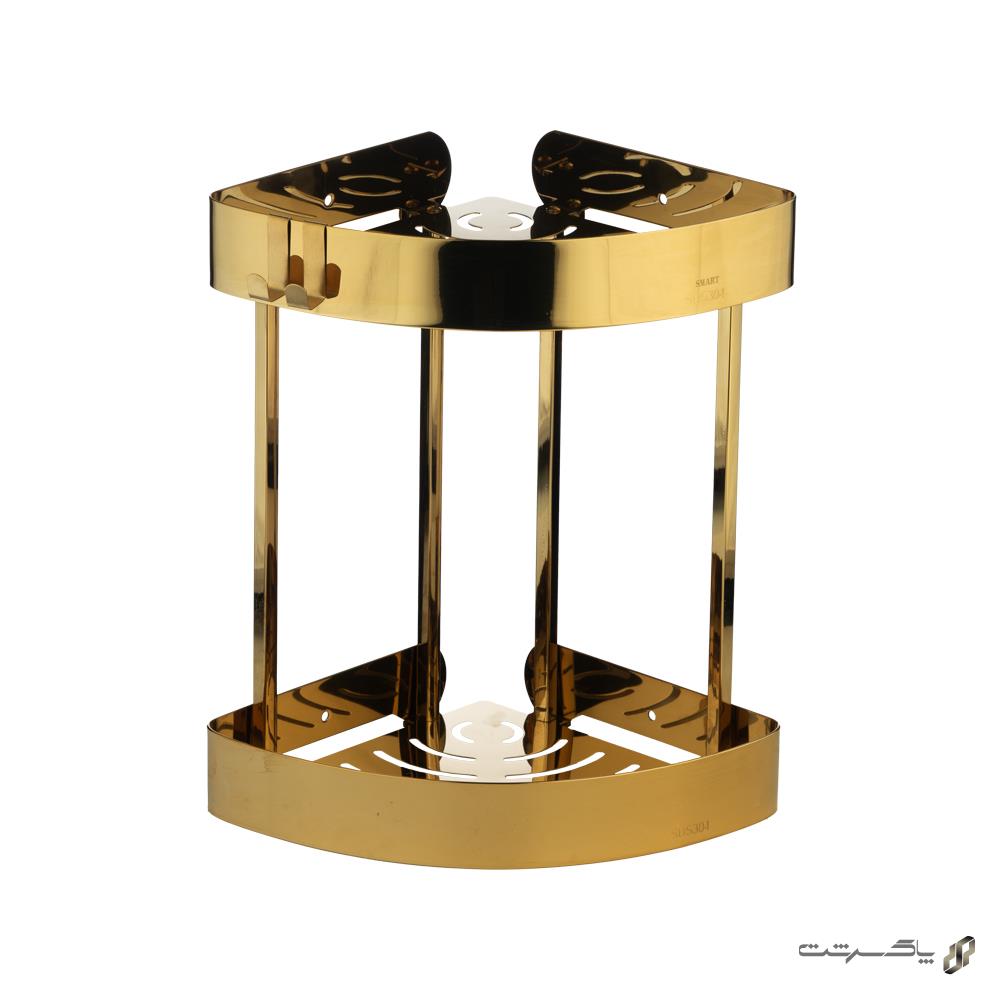 شلف کنج دوطبقه طلایی مدل ۱۰۱۲/GO برند اسمارت متریال استنلس استیل، با رنگ طلایی گرم و براق، ظاهری لوکس، مجلل و بسیار شیک به حمام یا سرویس بهداشتی شما میبخشد. طراحی کنج دوطبقه با خطوط تمیز و درخشش طلایی، فضایی مرتب، گرم و باپرستیژ ایجاد میکند که با دکوراسیونهای مدرن لوکس، نئوکلاسیک یا کلاسیک فوقالعاده هماهنگ است.