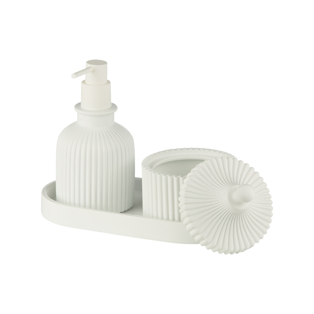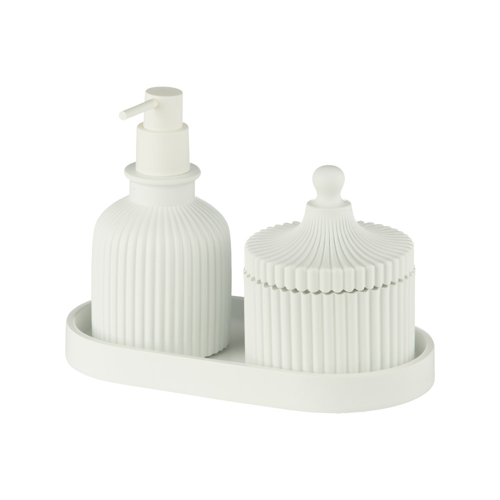 ست ۳ پارچه رزین سفید رنگ مدل AD-280 B/WH از برند اسمارت شامل یک سینی، یک جای مایع و یک ظرف لوازم بهداشتی است. این ست اکسسوری سرویس بهداشتی و حمام با رنگ سفید هماهنگ و متریال رزین، زیبایی و نظم را به فضای روشویی یا سینک آشپزخانه میآورد.