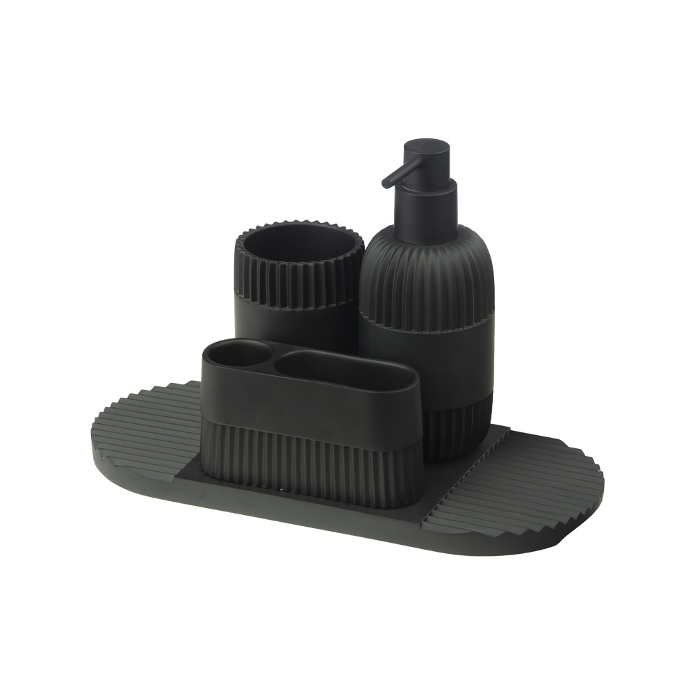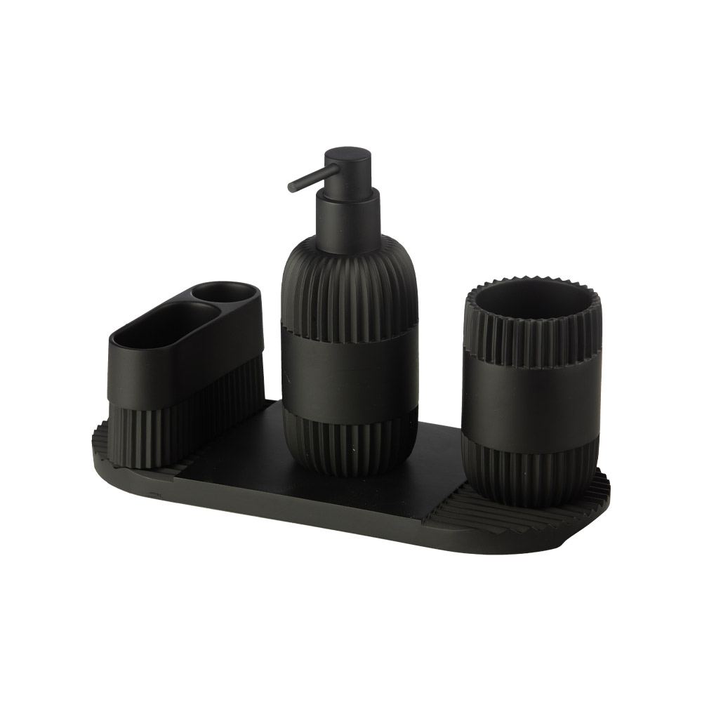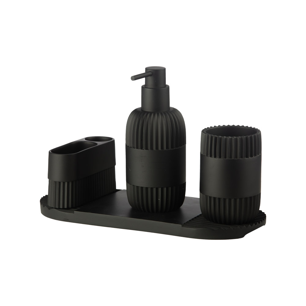 ست ۴ پارچه رزین مشکی رنگ مدل AD-254 D/BL از برند اسمارت شامل جا مایع، جا مسواکی، سینی و ظرف لوازم بهداشتی است. این ست اکسسوری سرویس بهداشتی و حمام با رنگ مشکی هماهنگ و متریال رزین، زیبایی و نظم را به فضای روشویی یا سینک آشپزخانه میآورد.