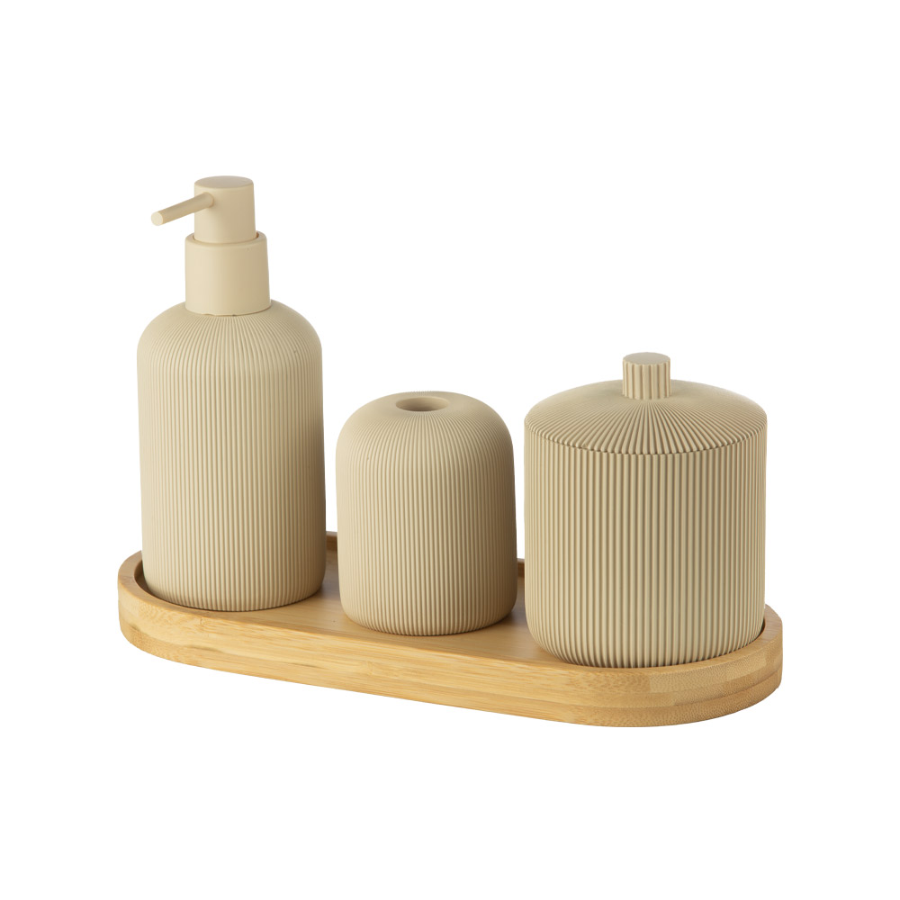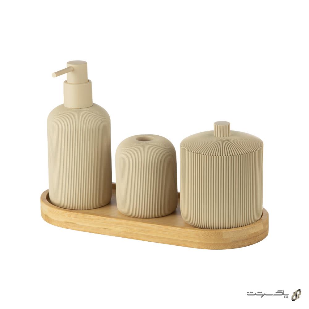 ست ۴ پارچه رزین کرم رنگ مدل AD-300 A/Cream از برند اسمارت شامل جا مایع، جا مسواکی، سینی و ظرف لوازم بهداشتی است. این ست اکسسوری سرویس بهداشتی و حمام با رنگ کرم هماهنگ و متریال رزین، زیبایی و نظم را به فضای روشویی یا سینک آشپزخانه میآورد.