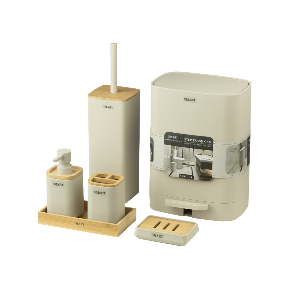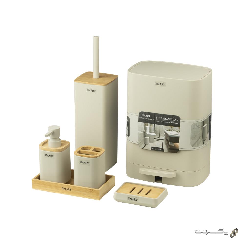 ست اکسسوری سرویس بهداشتی ۶ تکه لونا کرم مدل Luna/Cream از برند اسمارت شامل جا مایع، جا مسواکی، سینی، جا صابونی، فرچه توالتشوی و سطل زباله است. این ست اکسسوری سرویس بهداشتی و حمام با رنگ کرم هماهنگ و متریال رزین، زیبایی و نظم را به فضای سرویس بهداشتی میآورد.