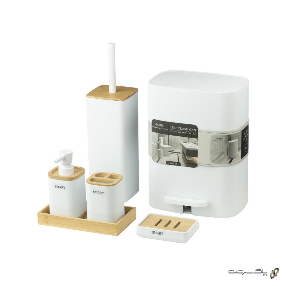 ست اکسسوری سرویس بهداشتی ۶ تکه لونا سفید مدل Luna/WH از برند اسمارت شامل جا مایع، جا مسواکی، سینی، جا صابونی، فر چه توالتشوی و سطل زباله است. این ست اکسسوری سرویس بهداشتی و حمام با رنگ سفید هماهنگ و متریال رزین، زیبایی و نظم را به فضای سرویس بهداشتی میآورد.