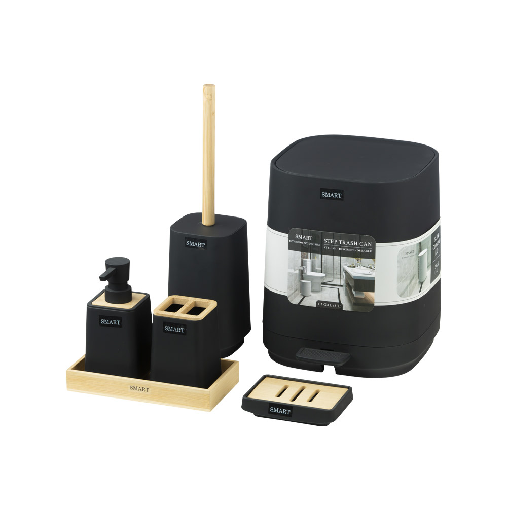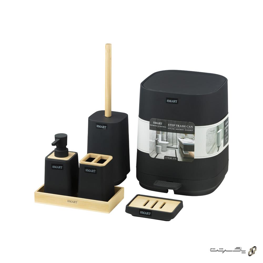 ست اکسسوری سرویس بهداشتی ۶ تکه ونیز مشکی مدل Veniz/BL از برند اسمارت شامل جا مایع، جا مسواکی، سینی، جا صابونی، فرچه توالتشوی و سطل زباله است. این ست اکسسوری سرویس بهداشتی و حمام با رنگ مشکی هماهنگ و متریال رزین، زیبایی و نظم را به فضای سرویس بهداشتی میآورد.