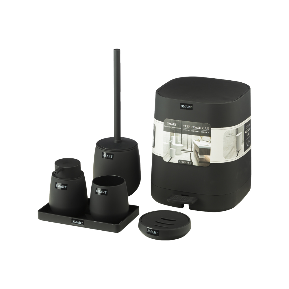 ست اکسسوری سرویس بهداشتی و حمام ۶ تکه مشکی Alvin/BL برند اسمارت، با رنگ مشکی عمیق و قدرتمند، ظاهری بسیار مدرن، جسورانه و شیک به سرویس بهداشتی شما میبخشد. طراحی هماهنگ و خطوط ساده تمام قطعات، فضایی مرتب، حرفهای و امروزی ایجاد میکند که با دکوراسیونهای صنعتی، تاریک، مینیمال یا کنتراستدار فوقالعاده هماهنگ است.